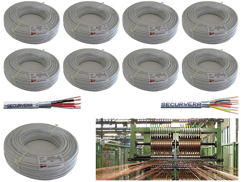 I cavi schermati flessibili antifiamma sono prodotti per essere utilizzati negli impianti di allarme filari o misti radio filo, necessari per collegare le periferiche alla centrale, oppure nei punti di derivazione protetti. È sconsigliato interrompere o aggiuntare il cavo senza le dovute protezioni. Come, dove e quale tipo di cavo utilizzare per collegare le diverse periferiche ad una centrale di allarme: Cavo di Allarme 2XØ0,22 mm² da utilizzare per collegare Contatti Magnetici o qualsiasi sensore passivo, purchè la centrale rilevi separatamente l'allarme, e abbia il controllo del Tamper o H24 Tramite doppio o triplo bilanciamento. Cavo di Allarme 2XØ0,50+2XØ0,22 mm² da utilizzare per collegare periferiche che necessitano di alimentazione (come rilevatori di presenza Infrarosso doppia tecnologia), purchè la centrale rilevi separatamente l'allarme, e abbia il controllo del Tamper o H24 Tramite doppio o triplo bilanciamento. I nostri cavi rispondono alla norme CEI20-11; cei 20-29; CEI 20-20; CEI 20-22/III (IEC60332); CEI 36762. I conduttori unipolari colori standard 0,22 mm² o superiore previsti per i segnali delle periferiche collegate, superano la tensione 1000 Vcc x 5 primi CEI 20-20. Prodotto assemblato e selezionato nello stabilimento della Securvera Roma. Garantito a norma di Legge contro difetti e vizi di fabbrica |
